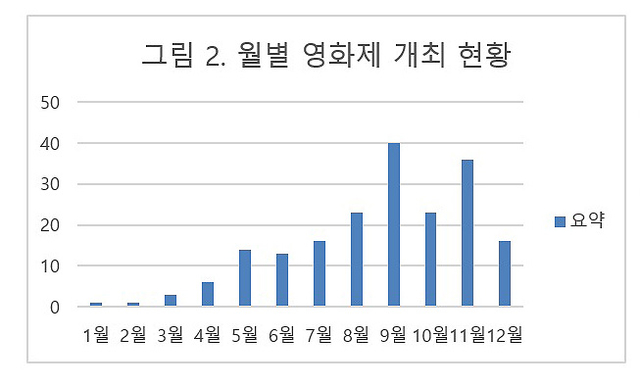 지역별로는 총 56개 시도에서 열렸으며 이 중 서울에서 78개(41%), 부산에서 15개(7.8%)가 개최되었다. 영화제들은 재원 조달을 복합적으로 하지만 주요 재원의 원천이 관이냐 민이냐로 대별된다. 국고(18개)나 지방자지단체 재원(116개)에 주로 의존하는 영화제가 134개로 전체 70%를 차지했다. 개최 시가를 월별로 보았더니 하반기에 쏠리는 현상이 심하게 드러났다. 152개의 영화제가 하반기에 몰려 있었다. 거의 80%에 육박하는 심한 편중이다. 왜 그런가? 예산 집행의 특성과 관계가 깊지 않겠나 짐작해 볼 수 있다.