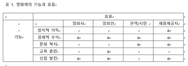 흔히 영화제가 산출할 수 있는 긍정적 기능을 경제적, 문화적, 산업적 측면에서 논의한다. 표 1은기능과 효용을 함께 고려했을 때 어떤 기능이 누구와 연관되는 지를 나타낸다. 나는 여기에 정치적 및 교육적 기능을 추가하였다. 한국의 맥락에서 매우 중요하기 때문이다. 효용 역시 많은 경우 두리뭉실하게 논의되는 경향이 있는데 구체적으로는 누구에게 가는 효용이냐에 따라 내용이 복잡하다.